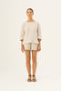 Der lockere Oversize-Schnitt sorgt für eine schmeichelhafte Silhouette und bietet gleichzeitig viel Bewegungsfreiheit. Die weiten 3/4-Ärmel, seitlichen abgerundeten Schlitze und der leicht verlängerte Rücken verleihen dem Top eine moderne, entspannte Form, die sich vielseitig kombinieren lässt – von lässig bis elegant.